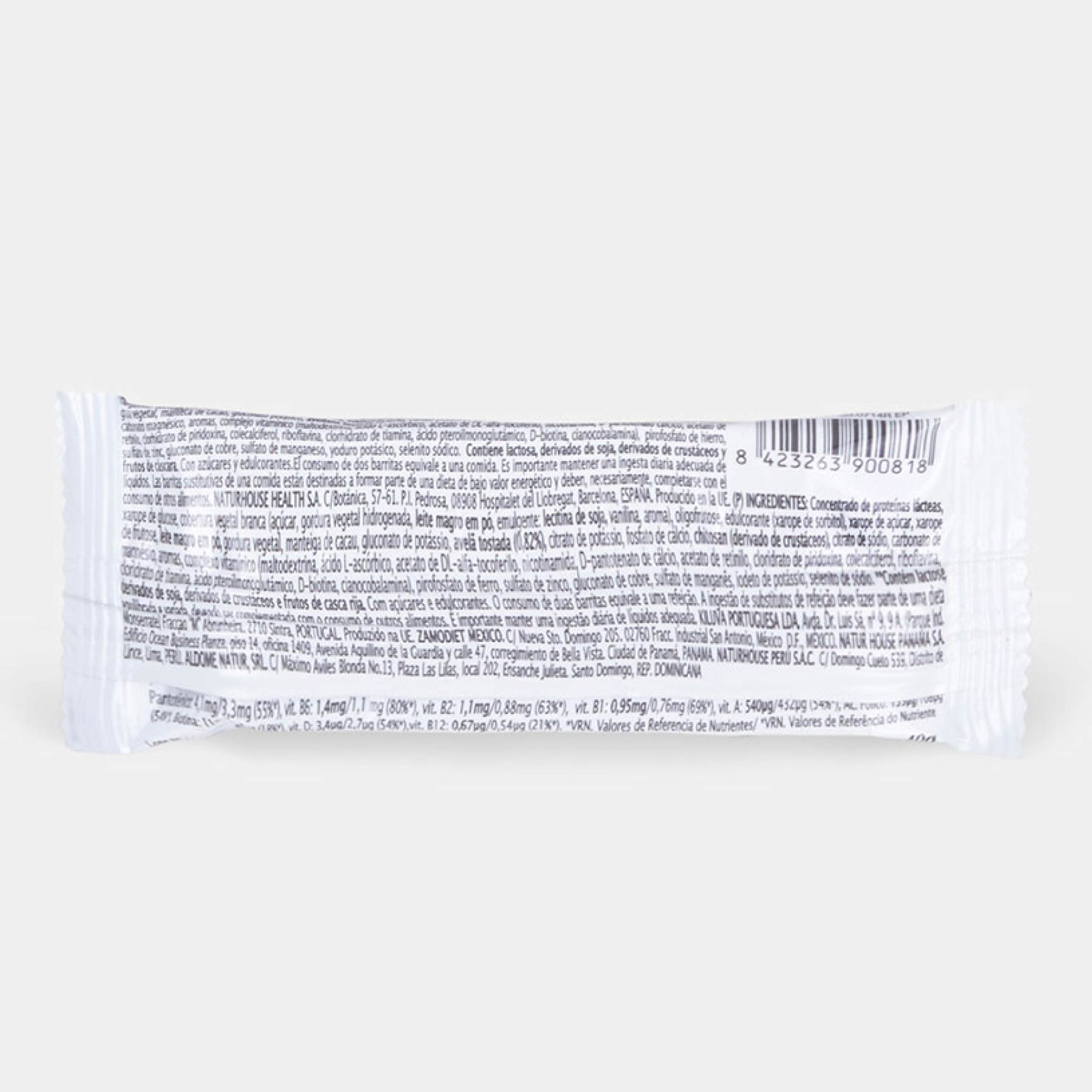 Proteine din lapte, înveliș vegetal alb[(zahăr, grăsimi vegetale (nucă de cocos), lapte praf degresat, unt de cacao, emulgator (lecitină de soia), aromă naturală de vanilie, aromă)], sirop de oligofructoză, îndulcitor (sirop de sorbitol), sirop de porumb, complex de minerale (gluconat de potasiu, fosfat de calciu, carbonat de magneziu, citrat de potasiu, citrat de sodiu, difosfat feric, sulfat de zinc, gluconat cupric, sulfat de mangan, iodură de potasiu, selenit de sodiu), sirop de glucoză, celuloză microcristalină, lapte praf degresat, unt de cacao, inulină, ulei de șofrănel (Carthamus tinctorius, semințe), polidextroză, pectină citrică, glucomanan, arome (conțin lapte), L-cistină, complex de vitamine (acid L-ascorbic, acetat de DL-alfa-tocoferil, nicotinamidă, D-pantotenat de calciu, acetat de retinil, colecalciferol, clorhidrat de piridoxină, riboflavină, filochinonă, clorhidrat de tiamină, acid pteroilmonoglutamic, D -biotină, cianocobalamină), alune măcinate prăjite (0,28%), L-carnitină.