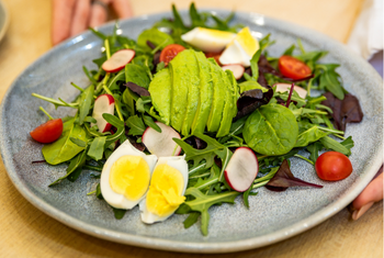 Ingrediente: salată verde, castravete, avocado, ou fiert, semințe de in, o lingură de ulei de măsline și zeamă de lămâie.